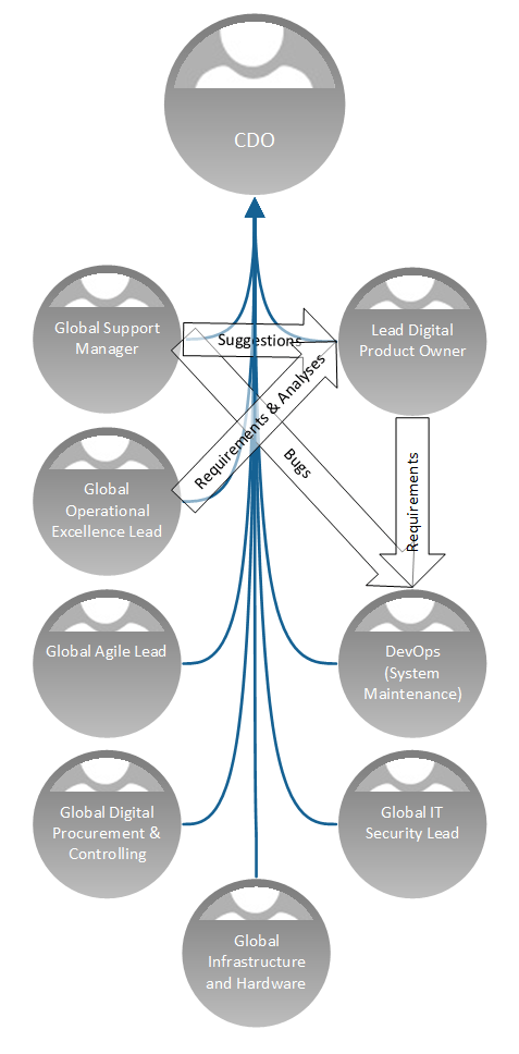 Support: This function is to be seen as the support team., hence both supporting Suppliers, Customers and internal users with technical problems and user support. It is true that it is very common to place this team as its own team or connected to other departments. However, proximity to the Product Owners and Engineers gives big benefits when it comes to decide what needs to be modified and/or improved. In effect they become the voice of the users after roll-out of a new function or system.