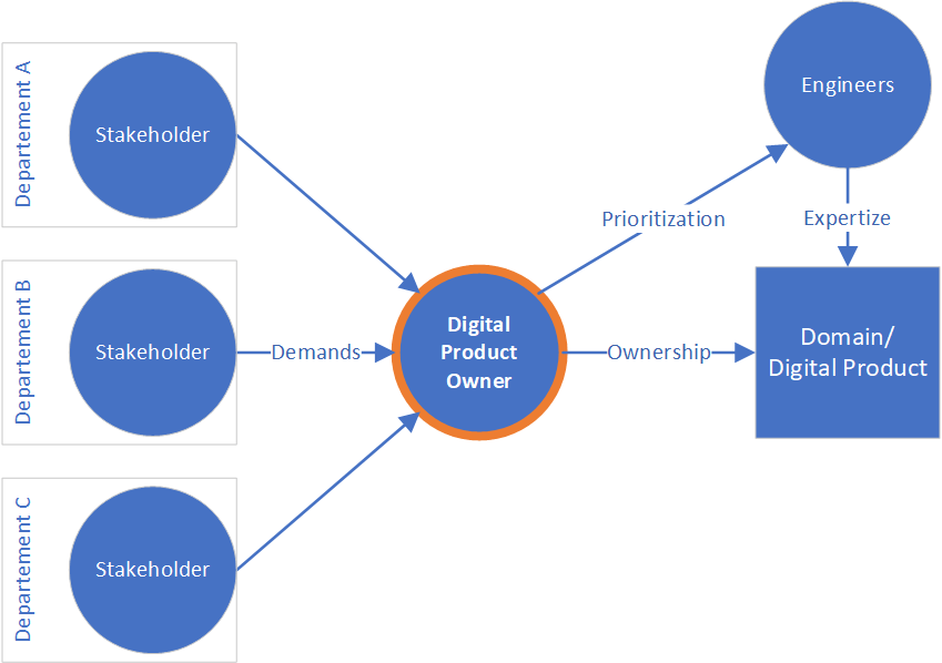 Hence, the Digital Product Owner becomes the servant of the stakeholders, and the funnel to the engineers/developers, who are responsible for bringing the ideas and improvements to life.