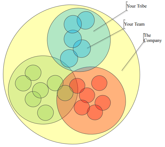 The image above tries to explain that we have several tribes with different purposes in the company. In each tribe you have one or more teams and these teams are to various degrees dependent on each-other. The same way different tribes may or may not have dependencies.