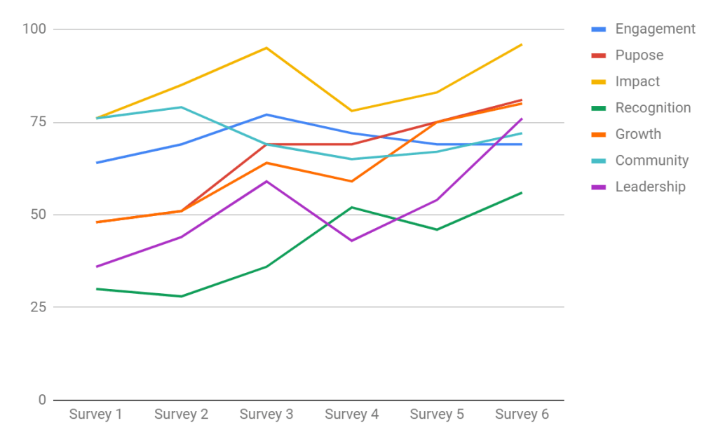 However, I hope you can agree that the changes contributed to an upward trend in general and I am especially happy that the happiness with the leadership went from 30% to 75% during this time.