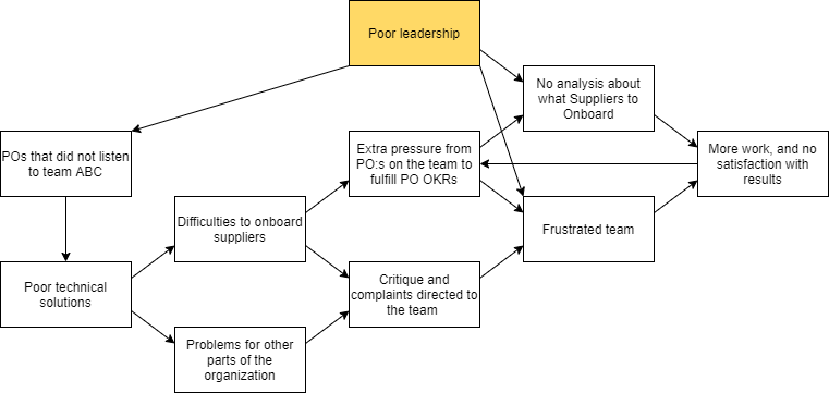 The problems described above, can be illustrated in a problem mapping. It is of course impossible to find out exactly what is the chicken and what is the egg, but I set great importance to the leadership, so lets use that as starting point.